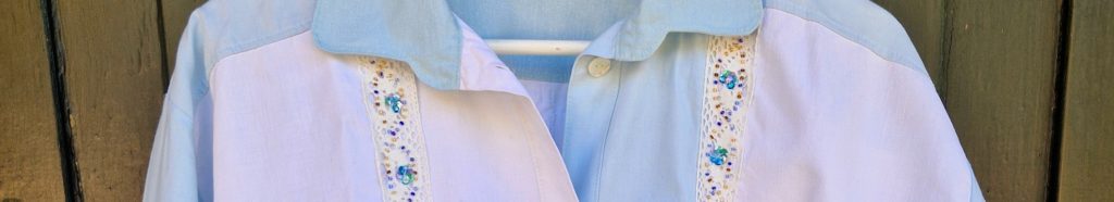 Vi er to – lidt ældre – kvinder, der upcycler tøj og stof, så det får endnu et godt liv. Lige nu har vi opkøbt et stort parti gammelt linned, som vi syr om til tøj og meget andet. Noget bliver farvet, andet ikke, noget bliver sat sammen med stof og tøj fra genbrugsbutikker, og vi genanvender fine knapper, pyntebånd, perler, som vi har opkøbt i små partier i butikker og hos private.