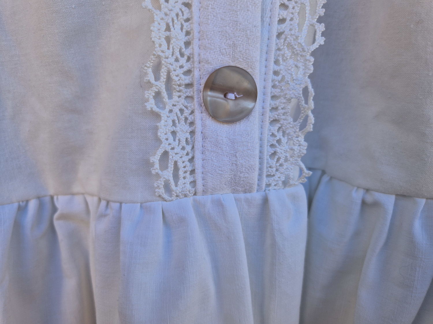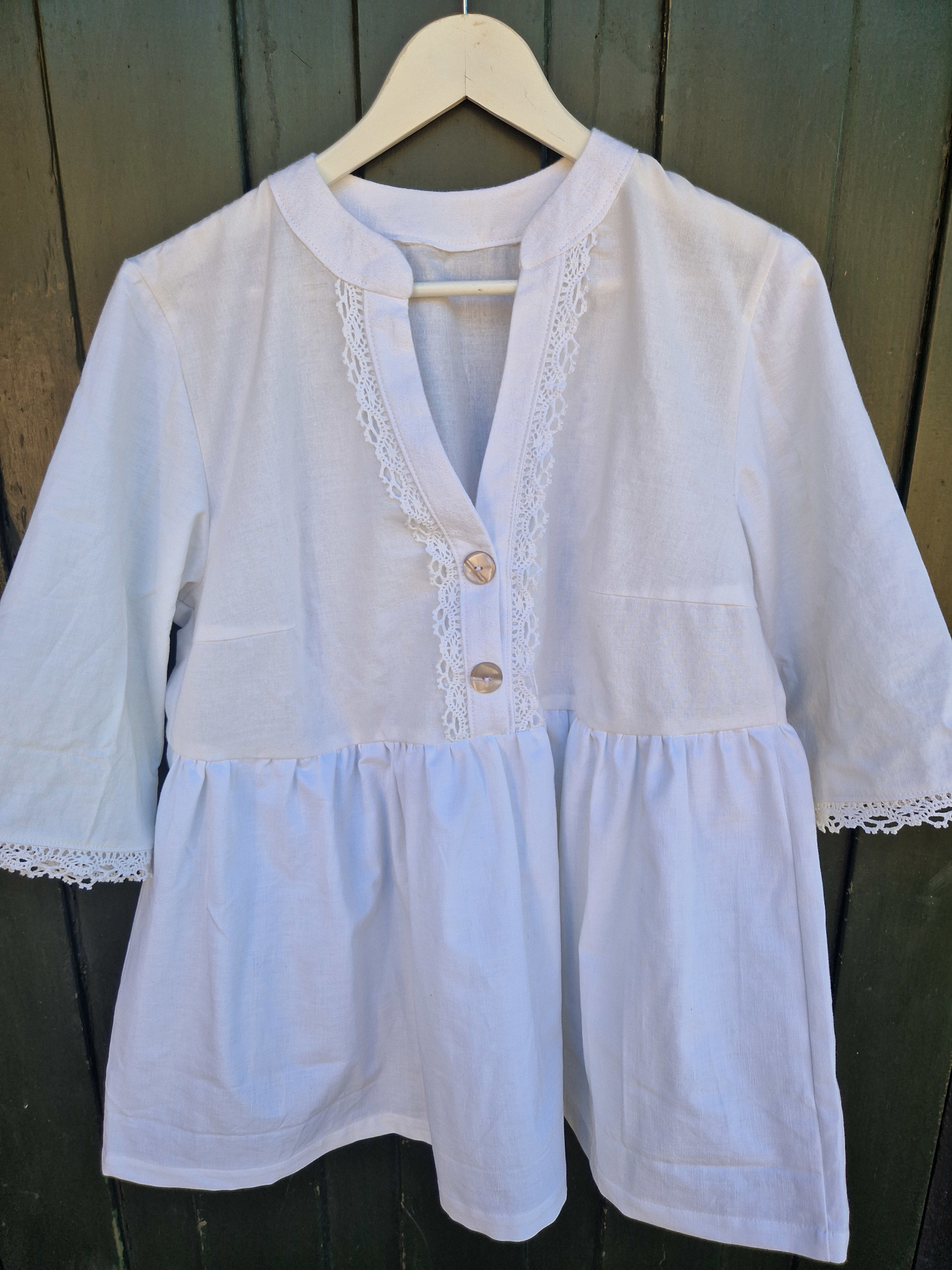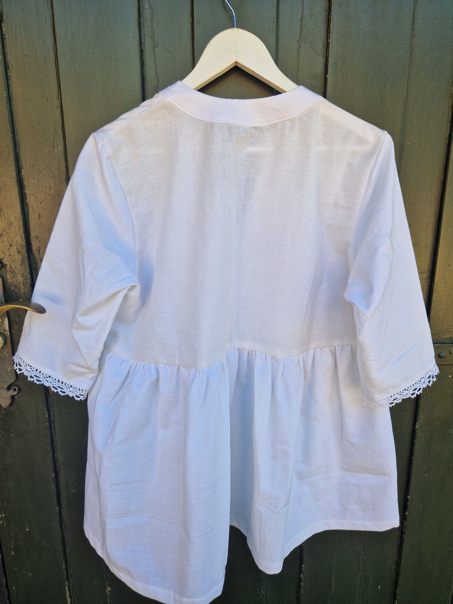 Demomodel: For tyk flies i kraven, rynker i halsudskæring og farveforskel i linnedstykker (ses dog som fin effekt).