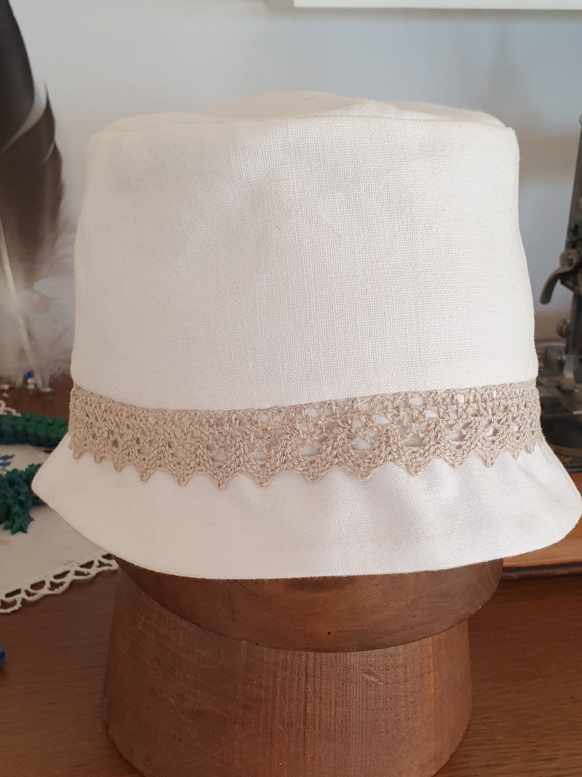 Unika. Baseret på gammelt linned Hvid sommerhat til børn med beige kantebånd. Omkreds: 54 cm.