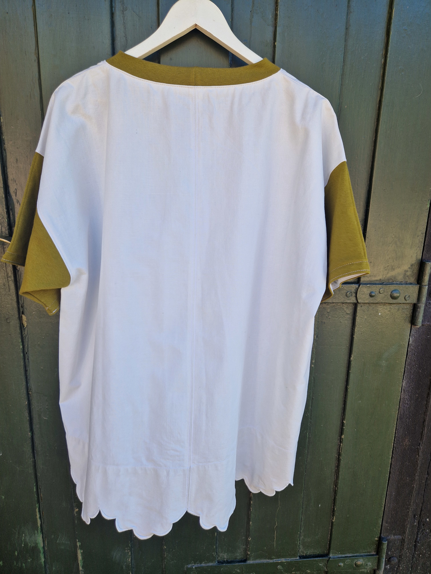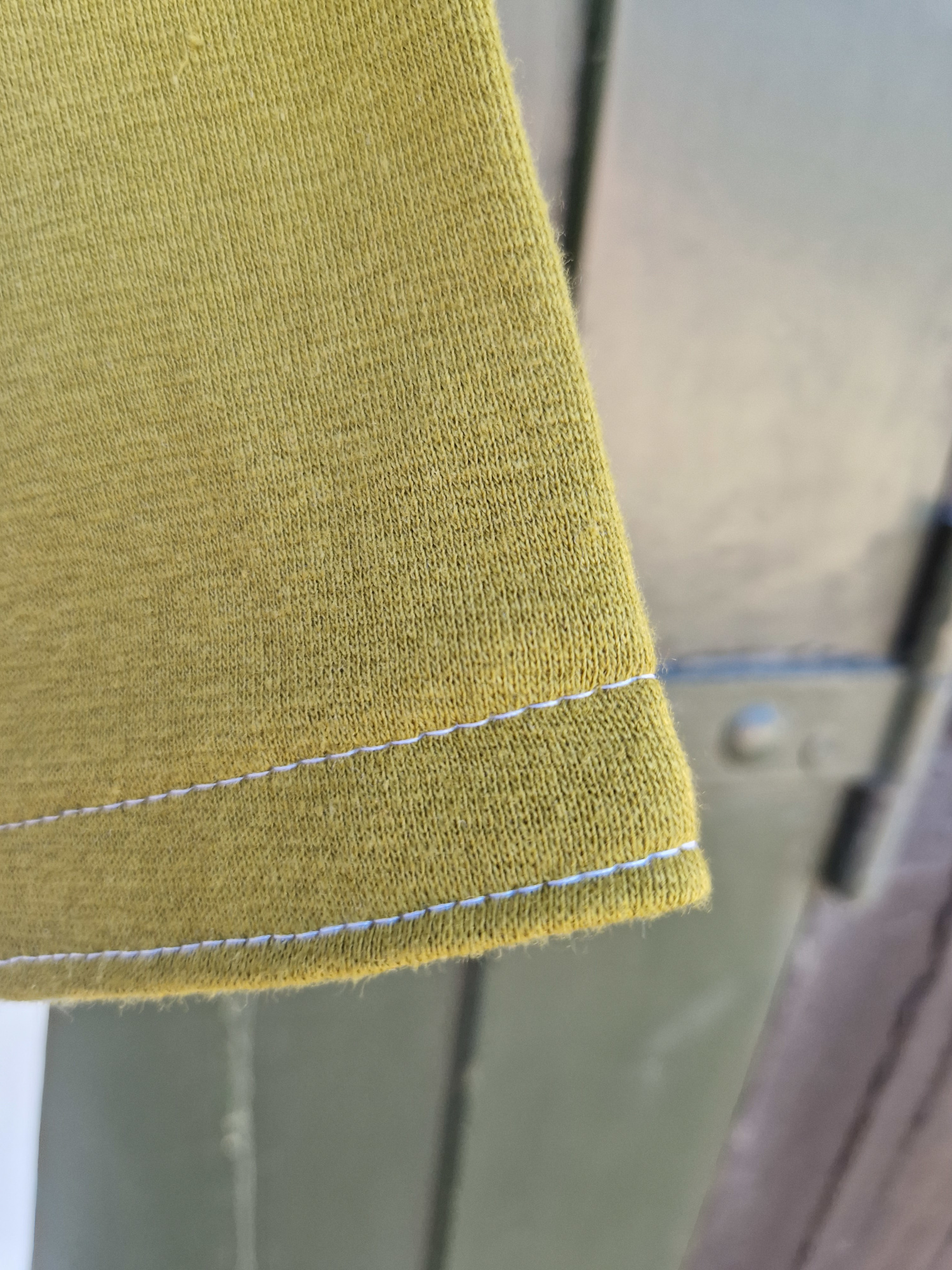 T-shirt med ærmer og halsudskæring af stof i vissengrøn farve.
